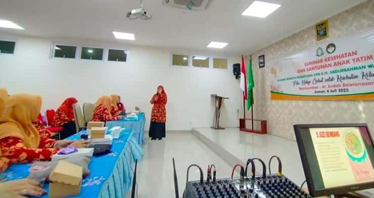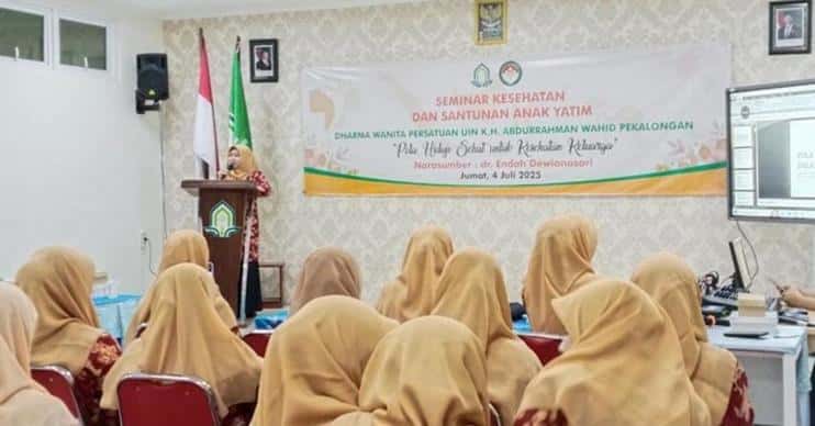 Usai acara santunan anak yatim, dilanjutkan dengan Seminar bertajuk “Pola Hidup Sehat untuk Kesehatan Keluarga” dengan menghadirkan narasumber utama, dr. Hj. Endah Dewianasari, seorang dokter dari Dinas Kesehatan Kota Pekalongan yang juga merupakan bagian dari keluarga besar Dharma Wanita Persatuan UIN Gusdur Pekalongan. Dalam paparannya, dr. Endah menjelaskan secara komprehensif berbagai aspek penting dalam membangun pola hidup sehat, mulai dari menjaga pola makan bergizi seimbang, pentingnya aktivitas fisik yang teratur, mengelola stres dalam keluarga, hingga menjaga kesehatan mental sebagai kunci kebahagiaan dan keharmonisan rumah tangga.
